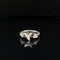 Captivating and unique, this 18k white gold diamond ring features an avant garde design, along with classic lines and contemporary aesthetics. Princess cut diamonds are prong set along the top surrounded by glittering round brilliant cut diamonds in dazzling halos. Additional diamonds are set on the slim band.
