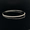 This super-luxe anniversary or special occasion brightly polished 18k rose gold bangle bracelet features a textured herringbone design along the edges and sparkling with round brilliant cut diamonds prong set in the center. A statement diamond shape takes center stage on the top of this stunning diamond bangle bracelet filled with diamonds.