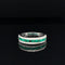 18k two-tone gold anniversary ring features emerald-cut emeralds bezel set in yellow gold milgrain trim. Glittering round brilliant cut diamonds prong set in groups of two creates clusters alternating with the emeralds, all arranged on a slim band for comfort and elegance.