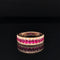 This stunning 18k two-tone gold wedding/anniversary ruby and diamond ring is the ultimate choice for your wedding moment and other special events. Oval cut rubies are prong set in three separate rows alternating with diamonds, giving it a basket weave design. Vibrancy and fire collide in an elegant band, all in a rich shine.