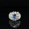 An oval cut vibrant blue sapphire sits nestled in a four prong setting on this brightly polished 18k white gold cocktail ring. Mixed cut diamonds are gracefully prong set around this sapphire in a decadent flower cluster. A split shoulder shank studded with round brilliant cut diamonds finishes the design of this nature-inspired sapphire ring.
