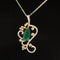 Unique and luxurious, this brightly polished 18k white gold anniversary or birthday pendant is fashioned into an intriguing double raindrop shape and features a prong set pear-shaped intense green emerald placed in the center. Sparkling round brilliant cut diamonds are prong set around this emerald, finished with filigree ribbon detail.