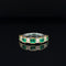 18k two-tone gold anniversary ring features emerald-cut emeralds bezel set in yellow gold milgrain trim. Glittering round brilliant cut diamonds prong set in groups of two creates clusters alternating with the emeralds, all arranged on a slim band for comfort and elegance.