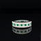 Treat yourself to something luxurious with this bespoke 18k white gold ring, finely crafted in a rich shine. Square step-cut diamonds and emeralds alternate on the top in shared prong settings, giving this stunning ring a chunky look. A smooth band lends comfort to this emerald and diamond wedding ring.