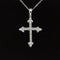 Sparkling round brilliant cut diamonds adorn this lavish Celtic Cross pendant, prong set in the center in glittering rows. A diamond solitaire sits in a center bezel setting, bringing this unique design together. Rich tendrils of gold wire outline the Cross in a floating halo style, giving this remarkable 18k white gold diamond Cross pendant a futuristic, unique design.