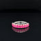Add vibrancy to your bridal ring set with this stunning 18k white gold ring. Two rows of prong set oval cut rich red rubies adorn the top, complemented by sparkling pave-prong set round brilliant cut diamonds, tapering into a slim band on the bottom.