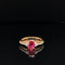 This petite ruby and diamond cluster ring is finely crafted in brightly polished 18k rose gold and features a rich red ruby in a prong setting artfully placed in the center. Sparkling round brilliant cut diamond accents are prong set in square bezels on a slender band, creating a remarkable design.