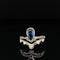 An oval cut vibrant blue sapphire sits nestled in a four prong setting on this brightly polished 18k white gold cocktail ring. Mixed cut diamonds are gracefully prong set around this sapphire in a decadent flower cluster. A split shoulder shank studded with round brilliant cut diamonds finishes the design of this nature-inspired sapphire ring.